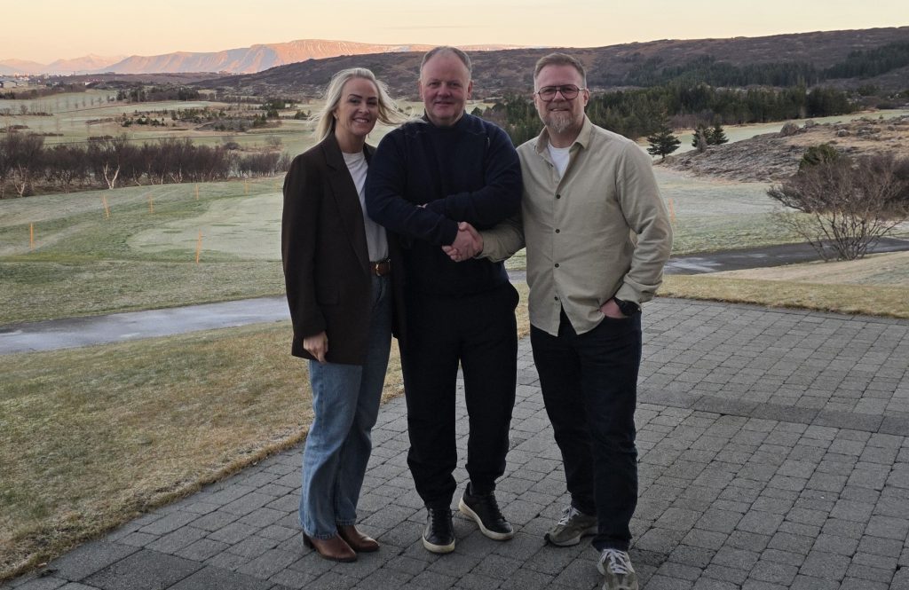 Eva og Alfreð eru nýir veitingaaðilar á Urriðavelli og munu reka staðinn undir nafninu holamathus. Hér eru þau með Haraldi framkvæmdastjóra Golfklúbbsins Odds.